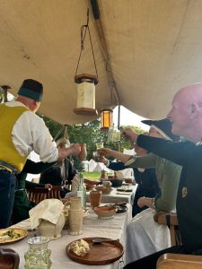 De ridders tonen hun wapens en harnassen en vertellen hier graag over. En een kleine demonstratie wordt zeker niet geschroomd. De boogschutter verteld over de longbow en kruisboog, en de vele soorten pijlen die daarbij horen. De kokkin haar pannen en potten, en laat graag zien wat er vroeger allemaal op het menu stond. De tingieter laat zijn kunsten zien en onder het genot van een beker bier of honingwijn, gaan we gezamenlijk aan tafel voor de welverdiende maaltijd.