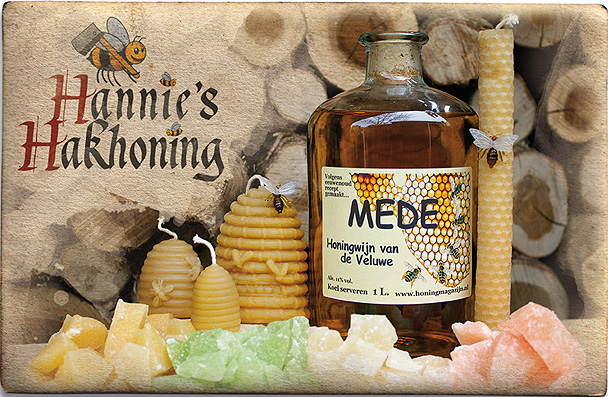 “Hakhoning is een middeleeuws product bestaande uit honing en kruiden. Hannie’s hakhonig maakt deze traditionele lekkernij op ambachtelijke wijze zelf. Naast hakhoning verkoopt ze ook kaarsen van bijenwas, mede en honig van de imker.”